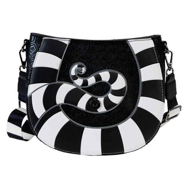 Traveling the deserts where the Sandworms live? Go in style! Bring along our gracefully ghoulish Beetlejuice Sandworm Crossbody Bag. Coiled like a sandworm from the movie, this creature comes to life in applique detail, with sumptuous black-and-white stripes. The menacing mouth opens, and you can see the head of another Sandworm inside. You can even pull that head out partway, but it snaps right back for an extra bite of fun. The full head of the Sandworm forms the front flap of the bag, and inside, you can find just enough room to pack what you need for a day trip. On the back, the Sandworm’s coil appears to drape down—and Beetlejuice peeks out. Make a hauntingly delightful impression wherever you go.