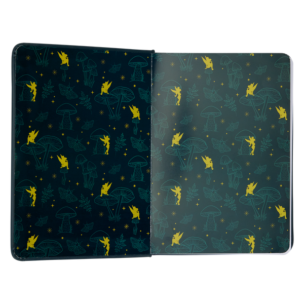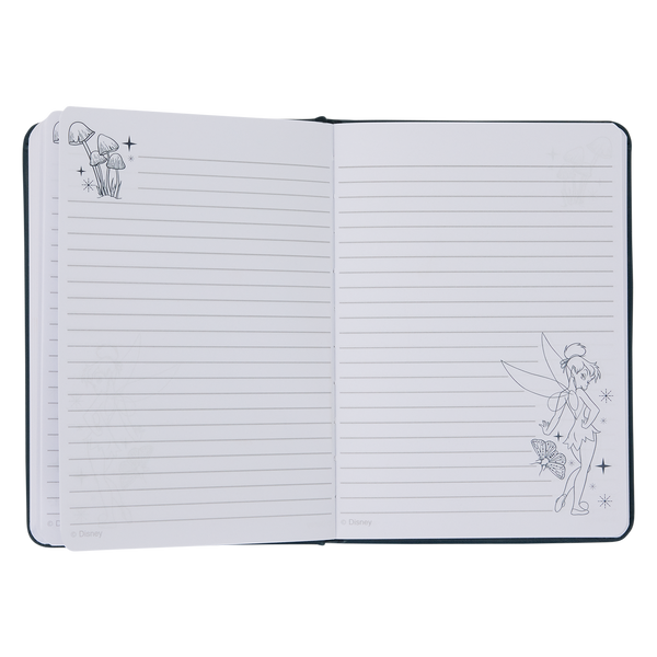 This journal features Disney’s Tinker Bell on the front sitting on a mushroom. Butterflies fly around her. On the back, you'll find another image of Tinker Bell surrounded by more butterflies. This journal features lined pages with images of Tinker Bell and mushrooms in the corners. When you finish filling up the journal, you can buy a paper refill and keep using it!