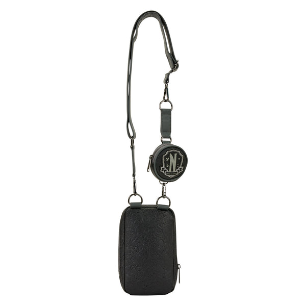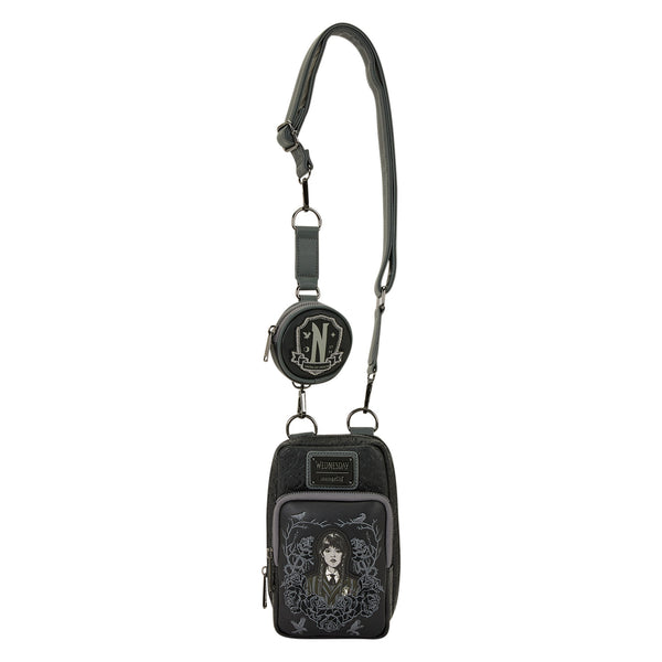 This bag features Wednesday on the front, surrounded by embroidered and embossed floral details. You'll find a detachable coin bag on the crossbody strap that features the Nevermore Academy emblem.